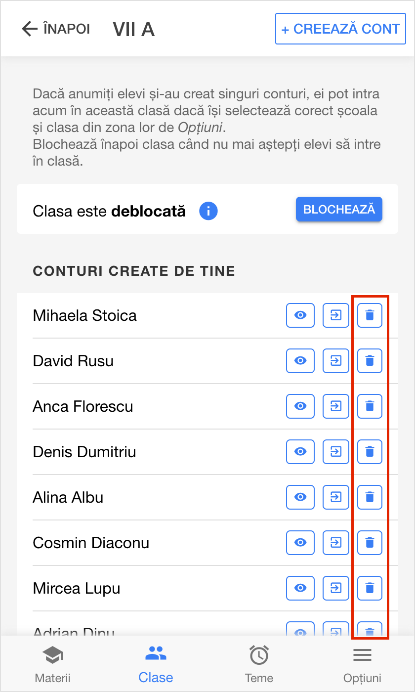 Pentru a șterge contul unui elev, accesează Clase > (selectează o clasă) > Conturi și apasă pe butonul ce indică ștergerea contului din dreptul elevului care dorești să fie șters:
