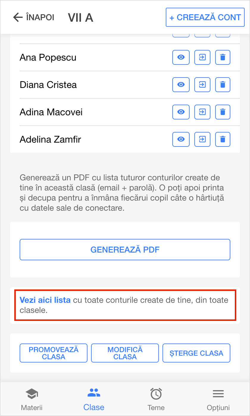 Dacă contul elevului pe care dorești să îl ștergi nu mai face parte din nicio clasă, accesează lista cu toate conturile create de tine:
